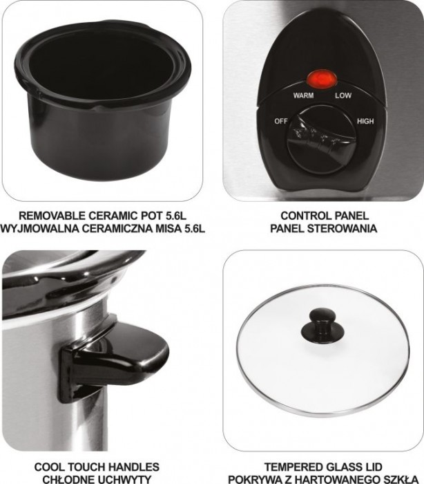 Při pomalém vaření je zachováno více nutričních hodnot a vitamínů. Zařízení je napájeno 1,1 m dlouhým 230 V kabelem. Příkon 320 W zajistí dlouhodobé vaření při 80 - 90 °C. Nepřilnavá keramická mísa pro vaření má objem 5,6 l a snadno se čiští. Navíc je opatřena skleněným víkem pro optickou kontrolu pokrmů. Tělo je zhotoveno z nerezové oceli oválného tvaru s otočným voličem uprostřed. Pro přenášení je navíc opatřeno madly, která se při vaření neohřívají.