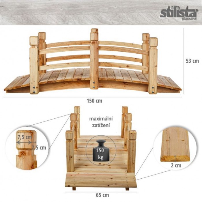 Popis: Zahradní dřevěný můstek, 150 x 67 x 55 cm, nosnost 150 kg