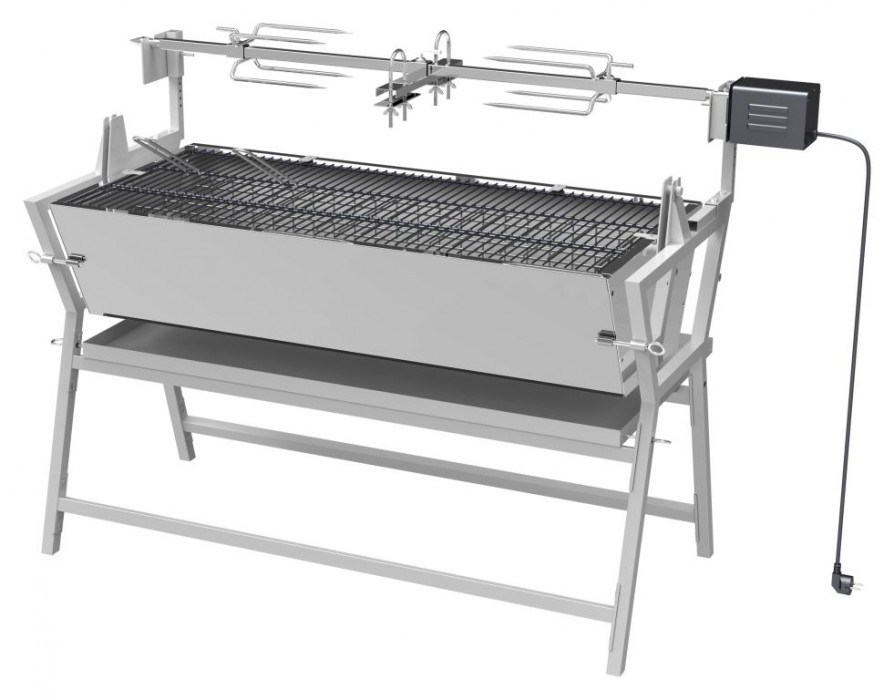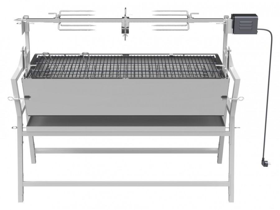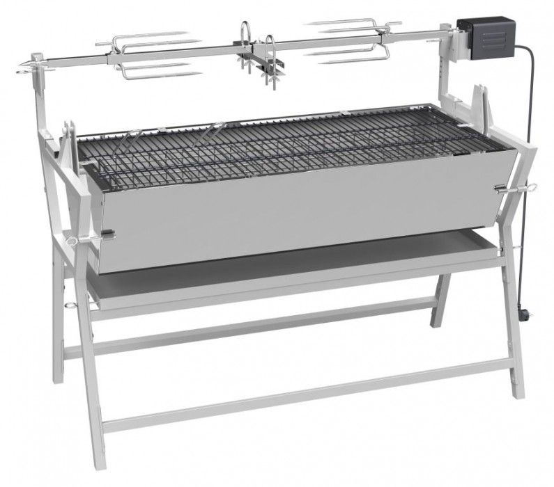 Konstruováno z oceli, s povrchovou úpravou, o rozměrech 138 x 96 x 62 cm. Pro samotnou tepelnou přípravu Vašich pochutin je gril opatřen ocelovým roštem s rozměry 102 x 46 cm. Konstrukce zajišťuje vysokou stabilitu. Gril je možné použít buď klasickým způsobem, případně palivovou spodní část překlopit na bok a využít tak možnosti grilovat na rožni ze strany s tím, že odkapávající mastnotu zachytí spodní plech. Plech na odkapávající tuk lze rovněž použít pro zakrytí palivové části. Gril je doplněn výkoným motorem s napájením na 230V pro otáčení pokrmů při rychlosti 3ot./min. Na vidlice - motor je možné naložit až 30 kg pokrmů. Gril je vhodný zejména pro grilování selátka, několika kusů kuřat, velkého množství masitých, ale i dalších pokrmů.