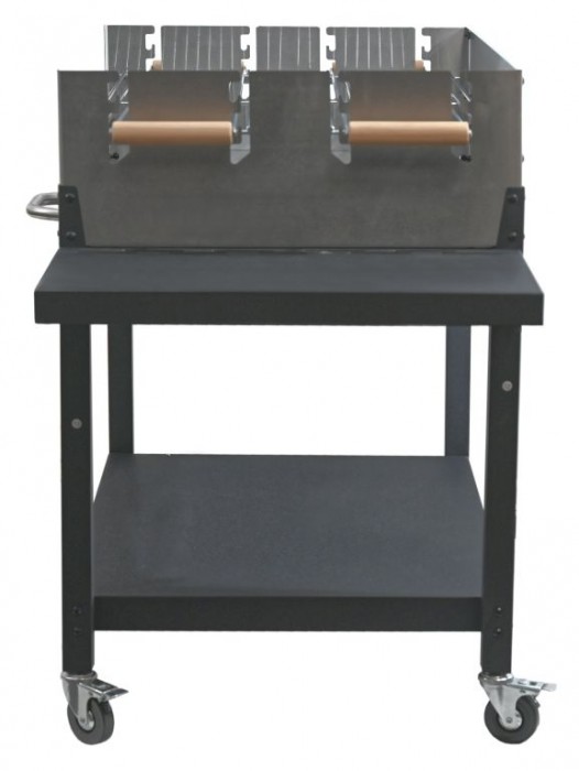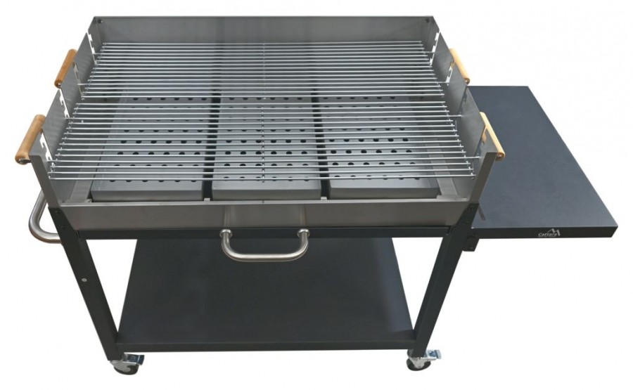 Grilovací plocha o velikosti 95 x 60 cm je vybavena dvěma nerezovými rošty, které lze pomocí bočních rukojetí nastavit do tří výškových úrovní (80 až 87 cm) podle potřeby. Snadný přístup ke třem samostatným nádobám na uhlí, po vyjmutí roštů, usnadňuje regulaci teploty a doplňování paliva.