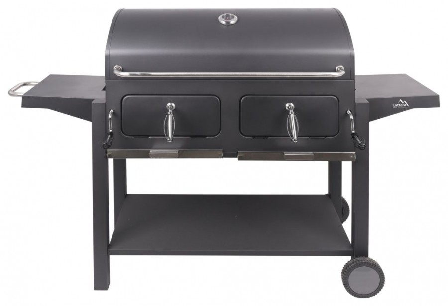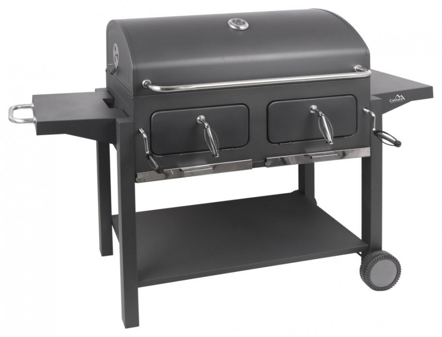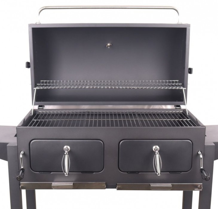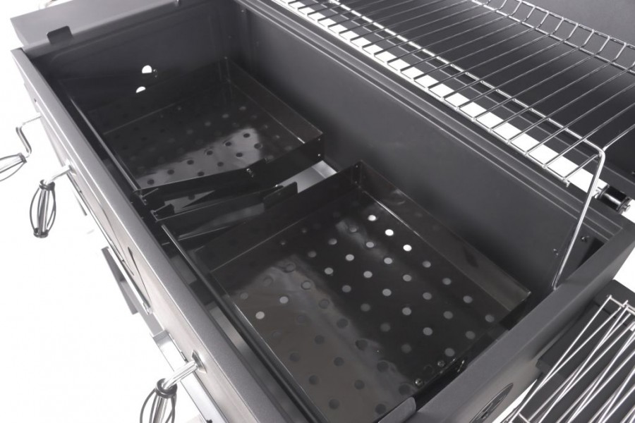 Vysoce stabilní konstrukce z precizně opracované oceli opatřené odolnou, hrubě černou barvou. Konstrukce je doplněna 2x kolečky usnadňující mobilitu grilu. Rám ve spodní časti slouží pro další zvýšení stability a rovněž jako odkládací prostor. Na bocích jsou umístěny skládací poličky pro odkládání rozličného vybavení pro grilování, nebo odkládání samotných pokrmů. Ovládací kovové prvky a rukojeti mají dostatečné rozměry pro pohodlný úchop a zajišťují snadnou manipulaci. Oboustranná ocelová regulace ventilace perfektně lícuje s konstrukcí. Vyklápěcí víko je ve vrchní části doplněné teploměrem pro stálou kontrolu teplot uvnitř grilu. Pro samotnou tepelnou přípravu Vašich pochutin je gril opatřen robustním, třídílným, roštem z oceli. Dále je grilovací prostor osazen odkládacím roštem pro udržení teploty již hotových pokrmů, nebo pro jejich předehřátí. Další předností grilu jsou rošty na uhlí s nastavitelnou výškou, grilovací prostor je tak možné regulovat pomocí mechanismů na přední straně, dle požadávků daných pokrmů. Dvířka na čelní straně grilu významně usnadňují doplňování uhlí. Pro usnadněné číštění jsou potom určeny zásuvky na popel v nejspodnější části grilovacího prostoru.
