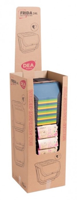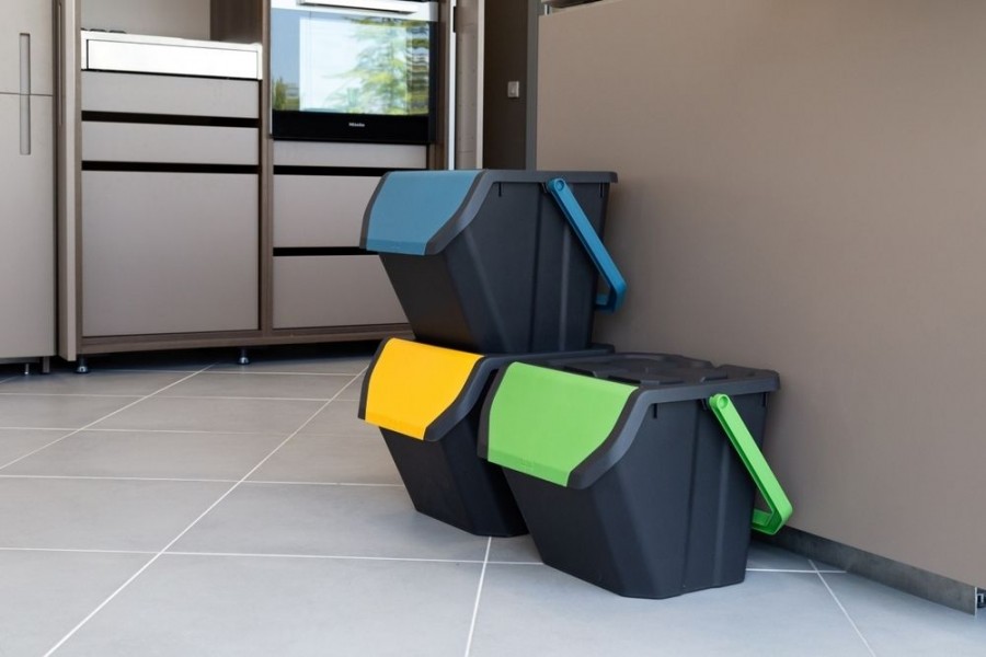 - Různě barevná víka: Koše FRIDA mají v setu odlišně barevná víka, což usnadňuje identifikaci různých typů materiálů pro snadnější třídění.