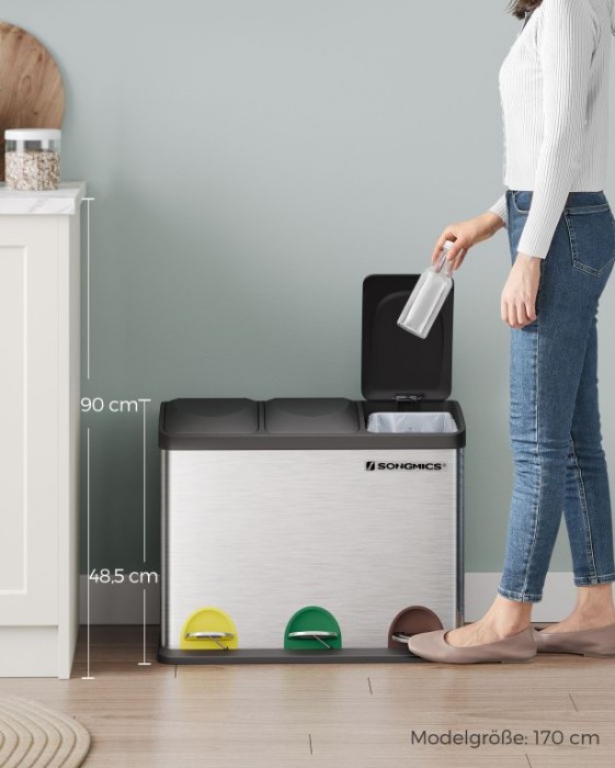 Celkový objem koše je 45 litrů, rozdělených do tří vyjímatelných nádob po 15 litrech. Díky praktickým držadlům je vysypání a čištění rychlé a bezproblémové. Těsnící víka spolehlivě brání úniku pachů, zatímco pevná nerezová konstrukce odolává vlhkosti i každodennímu používání. Otevírání pomocí pedálů zajišťuje hygienickou obsluhu, takže se koše nemusíte dotýkat rukama. Rozměry výrobku jsou 59,3 × 30,2 × 46,7 cm a při otevření víka dosahuje výšky 72 cm.
