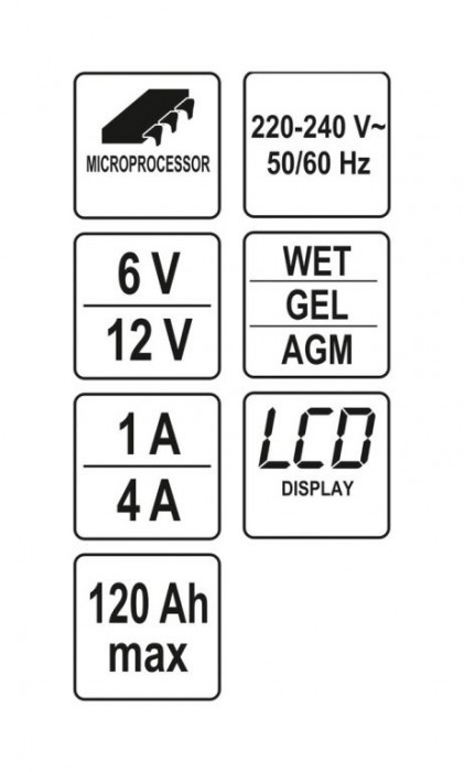 Nabíječka je vybavena vestavěnou mikroprocesorovou elektronikou, díky které zajišťuje mikroprocesor cílené nabíjení, aniž by došlo k přebití nebo poškození akumulátoru. Zajišťuje tím optimální podmínky pro ochranu a udržení akumulátoru v perfektní kondici. Mezi další užitečné funkce patří test baterie, alternátoru a startu.