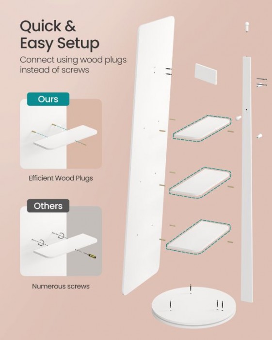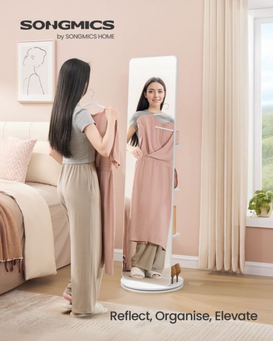 Objevte spojení stylu a praktičnosti v jednom produktu. Toto vysoké zrcadlo s minimalistickým designem a čistě bílou barvou skvěle doplní ložnici, předsíň i šatnu. Vše potřebné máte vždy po ruce díky 4 policím a 4 háčkům na zadní straně. Otočný mechanismus vám umožní snadný přístup ke všem uloženým věcem a zároveň si užít dokonalý pohled na celý outfit.
