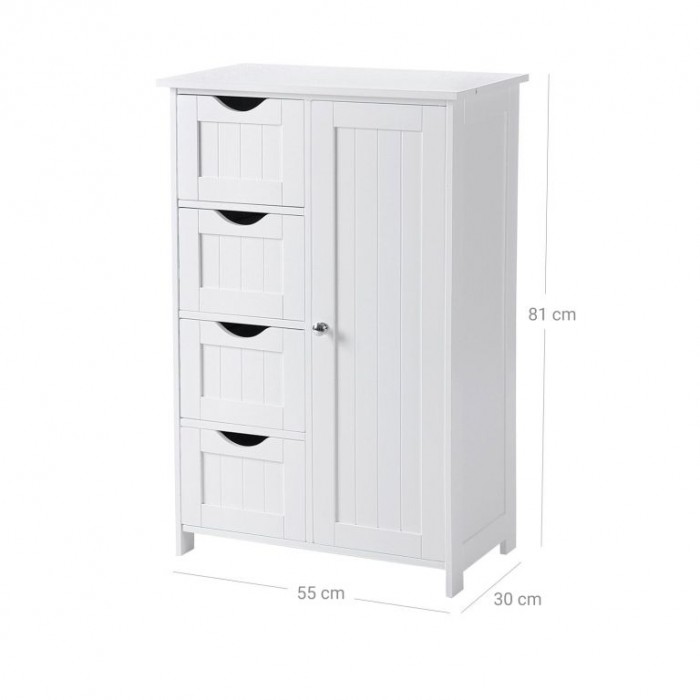 Rozměry 55 × 30 × 81 cm poskytují dostatek prostoru, aniž by skříňka zabírala místo navíc. Čtyři praktické zásuvky jsou ideální na menší věci, zatímco za dvířky najdete nastavitelnou polici s možností přizpůsobení pro vyšší i nižší předměty. Stabilní konstrukce z MDF je pevná a dlouhodobě odolná, navíc je vybavena bezpečnostním prvkem proti převrácení. Váží 13,7 kg, a přesto se díky kompaktním rozměrům hodí i do menších prostor.