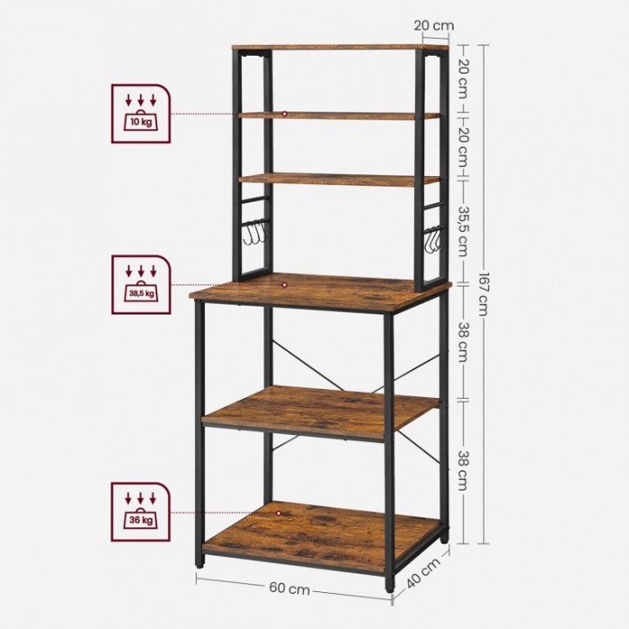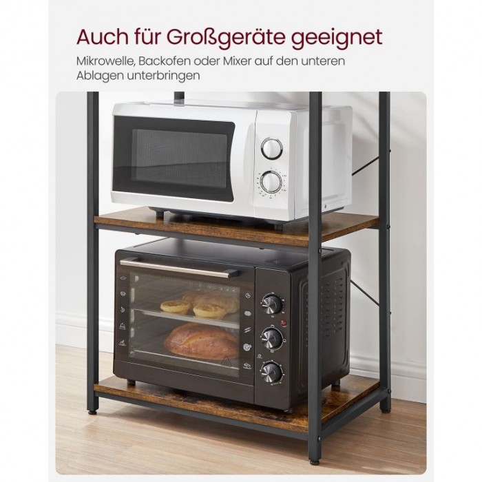 Kombinace oceli a dřevotřísky zajišťuje pevnost a dlouhou životnost. Nastavitelná výška spodní police umožňuje snadné uložení i větších spotřebičů. Regál je stabilní, snadno se montuje a díky ochraně proti převrácení je bezpečný i v domácnosti s dětmi.