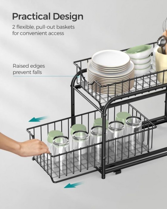 Už žádný chaos pod dřezem ani přetékající poličky! Tento 2patrový organizér vám pomůže využít každý centimetr prostoru. Díky výsuvným košům máte vše po ruce – od čisticích prostředků až po kosmetiku. Elegantní černý design navíc zapadne do každého moderního interiéru.