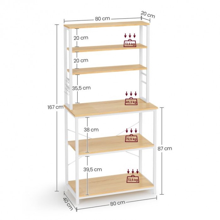 Zažijte radost z organizované kuchyně díky tomuto policovému regálu. S šesti policemi a praktickými háčky získáte přehled a dostatek místa pro všechny kuchyňské potřeby. Elegantní provedení v bílé a dubu se hodí do každého interiéru a usnadní každodenní vaření.