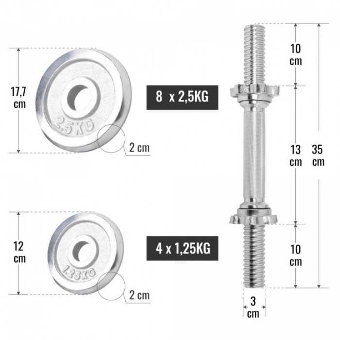 Sada se skládá z činkových tyčí, zátěžových kotoučů s různými hmotnostmi a praktickými hvězdicovými zámky. Rukojeti činek jsou žebrované pro lepší úchop. S touto sadou můžete posilovat paže, trup a dokonce i nohy při provádění dřepů a podobných cviků se závažím. Pomocí činek zapojte do cvičení také drobné svaly na krku nebo předloktí. Sada činek zaujme skvělým vzhledem. Stříbrný lesk vypadá velmi elegantně a dokonale se hodí k modernímu cvičebnímu vybavení a nábytku.