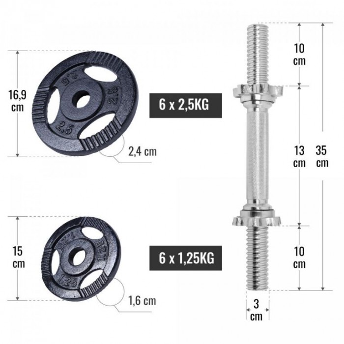 Trénink s činkami má své místo téměř v každém tréninkovém plánu. Praktické úchyty zajišťují dodatečnou bezpečnost zátěžových kotoučů. Sada činek v černé barvě zaujme i svým jednoduchým designem. Označení KG je na všech kotoučích. Otvor je vhodný pro všechny standardní tyče o průměru 30 mm.