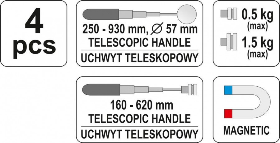 Sada obsahuje teleskopickou rukojeť délky 160 - 620 mm pro magnetické patky, teleskopickou rukojeť délky 250 - 930 mm s kloubovým inspekčním zrcátkem průměru 57 mm a magnetické patky 13; 16; 20 mm s nosností 0,5; 1; 1,5 kg.