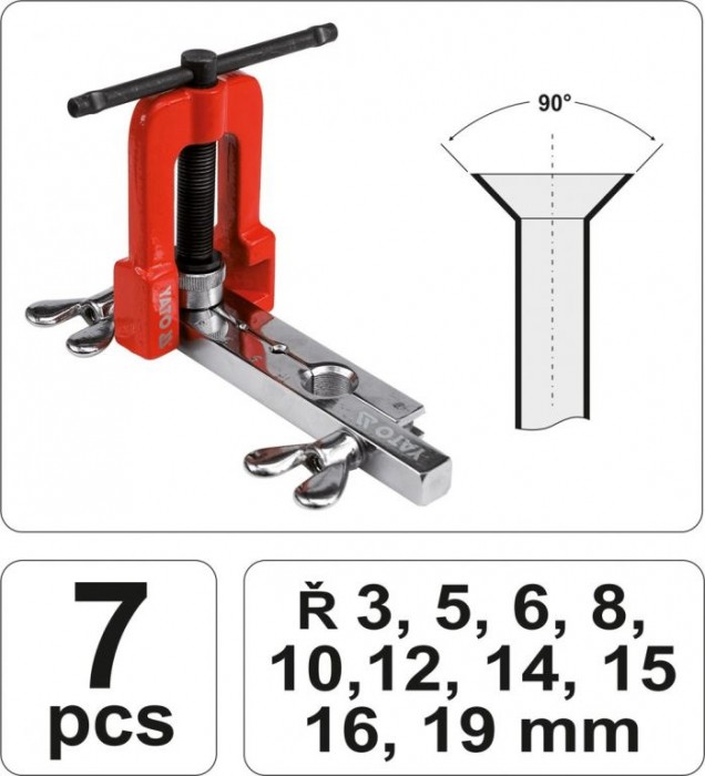 Lisovací nástroj pro ruční roztahování trubek a tváření kónických přírubových spojů s vrcholovým úhlem 90°. Přípravek je připraven na práci s odstupňovanými, normovanými průměry trubek 3; 5; 6; 8; 10; 12; 14; 15; 16 a 19 mm.