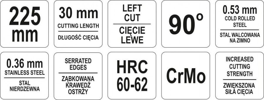 Nůžky délky 225 mm, na stříhání plechu s 90° vychýlením, levé.