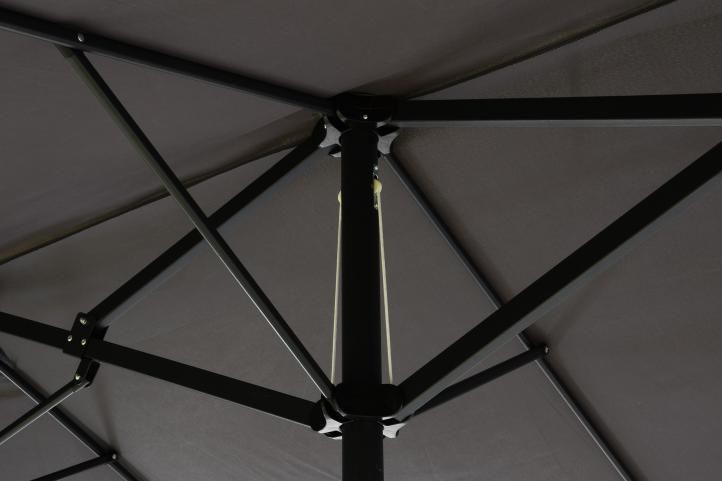 Zahradní slunečník má praktický oválný tvar. Ideální velikost 4,50 x 2,65 m poskytuje dostatek stínu pro požadované místo. Slunečník se skládá ze 2 střech se stínem, které umožňují větší stín pro větší prostor k sezení než běžný slunečník. Je dobrou alternativou k jakékoli markýze. Jednoduchá nekomplikovaná montáž a demontáž.