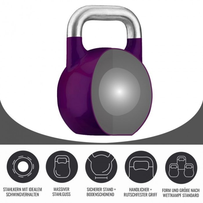 U fitness kettlebellů není specifikován materiál ani velikost. Oproti tomu jsou konkurenční varianty v zásadě vyrobeny z oceli a mají jednotnou velikost. Bez ohledu na hmotnost zvládá každý soutěžní kettlebell totéž. To vede k větší bezpečnosti při manipulaci. Robustní materiál si navíc dobře poradí s drsným kontaktem se zemí, k čemuž může dojít při intenzivním tréninku. Zde nabízený kettlebell je k dispozici s různými váhami, takže si můžete sestavit set kettlebellů podle svých představ. Spodní strana je zploštělá. Tímto způsobem se činka nedobrovolně neodvalí. Abyste mohli na první pohled rozlišit různé hmotnosti několika kettlebellů, každá váhová varianta má jinou barevnou povrchovou úpravu.