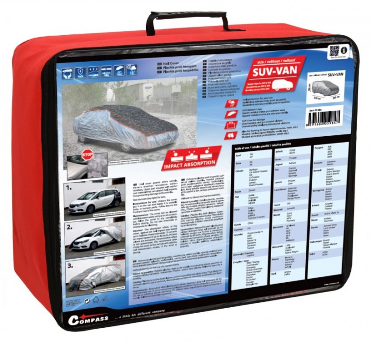 Ochranná plachta proti krupobití, k překrytí celého vozidla s vysokou odolností proti povětrnostním vlivům. Horní část vyztužená zesíleným materiálem, který dokáže absorbovat nárazy krup při krupobití a tím zamezí poškození vozidla. Jednoduché upevnění plachty - pouze se nasadí na automobil, na spodku se upevní část s všitou gumou za vhodné záhyby karoserie / nárazníku a přední i zadní část plachty se důkladně upevní pomocí všitých popruhů se sponami. Absorpční efekt plachty proti nárazu ledových krup je vysoce účinný až do velikosti kroupy cca 12 mm s nárazovou rychlostí do 74 km/h. Při překročení těchto hodnot není ochranný účinek zaručen.