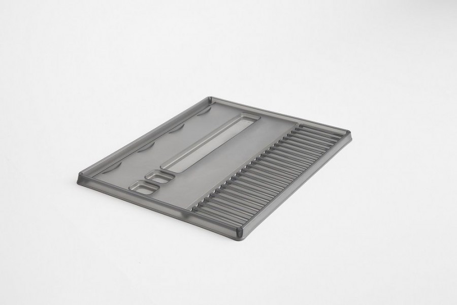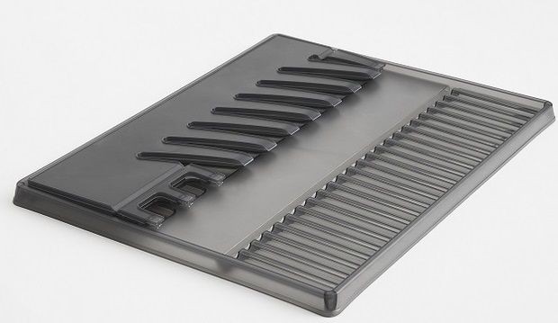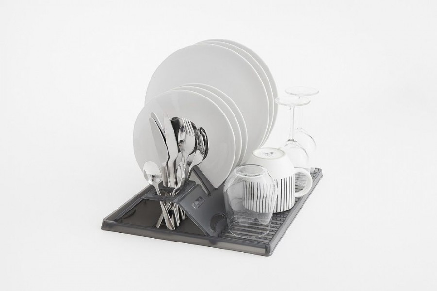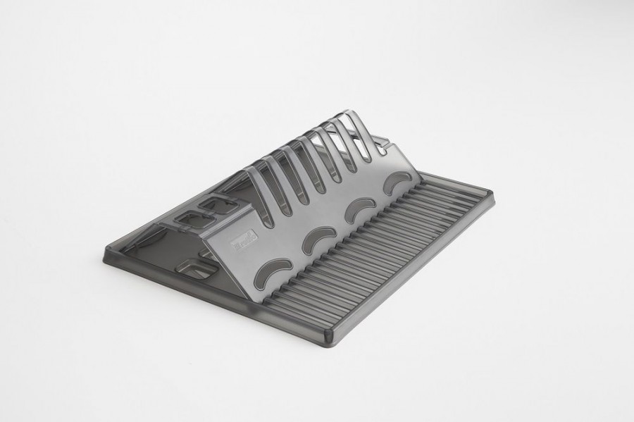 Skládací odkapávač na nádobí SPACE. Sada obsahuje gumové nožky, které odkapávač stabilizují a nadzvednou tak, aby zpod něj vytékala voda. Kvalita od švýcarské značky Rotho.