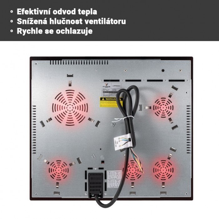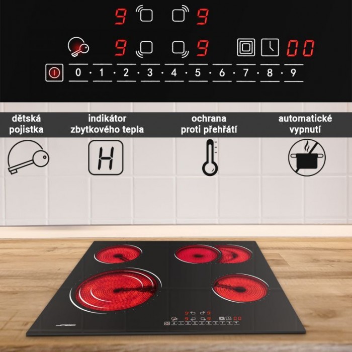 Vestavná sklokeramická varná deska se čtyřma varnými zónami. Je vhodná pro všechny typy nádobí (keramika, nerezová ocel, železo, hliník, měď, žáruvzdorné sklo atd.). Má technologii dotykového ovládání a devítistupňovou regulaci teploty. S kabelem (5-žilovým) bez zástrčky VDE. Bezpečnostní funkce: Dětský bezpečnostní zámek, Indikátor zbytkového tepla, Ochrana proti přehřátí, Automatické vypnutí. Jednoduché a intuitivní ovládání, devět stupňů výkonu a časovač 0 - 99 minut dělají z této sklokeramické varné desky dokonalého spojence pro dlouholeté potěšení z vaření.