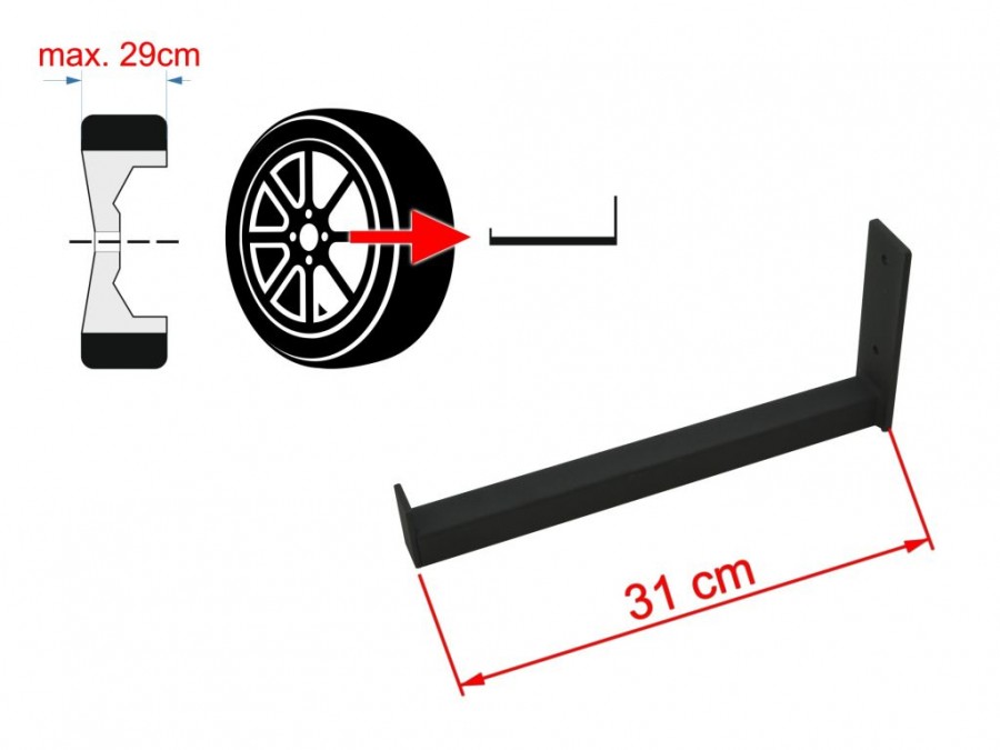 Ocelové držáky mají nosnost 30kg (jeden držák) a jsou uzpůsobeny pro umístění disků s pneumatikou. Disk se na držák umísťuje za středový otvor. Pro zamezení poškrábání disků jsou součástí balení samolepící pěnové chrániče.