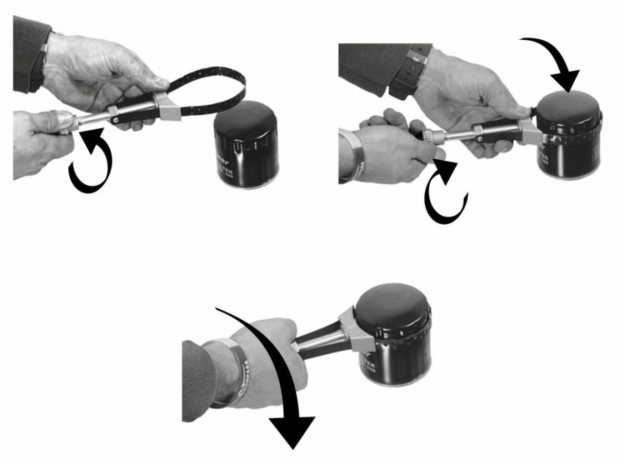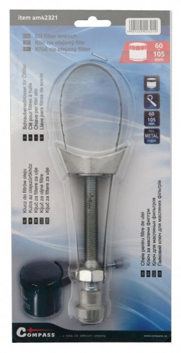 Univerzální stavitelný klíč je určen k montáži a demontáži olejových filtrů o průměru 60-105 mm. Díky své nastavitelné konstrukci se přizpůsobí různým velikostem filtrů, což usnadňuje manipulaci.