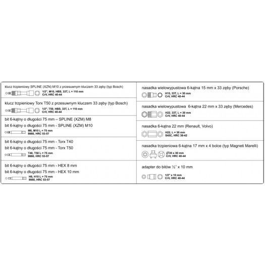 Profesionální sada nářadí pro montáž a demontáž alternátorů. Sada je použitelná pro alternátory typu Bosch a Magneti Marelli a pro automobily značek Audi, BMW, Fiat, Ford, Mercedes, Opel, Porsche, Renault, Peugeot, Seat, Škoda, Volvo, VW a další. Klíče umožňují, pomocí příslušného bitu, současné odšroubování šroubu řemenice, při souběžném přidržení kola spojky pomocí specialního nástavce. Sada je přehledně uložena v kufříku a jednotlivé nástavce jsou k použití s ráčnou 1/2".