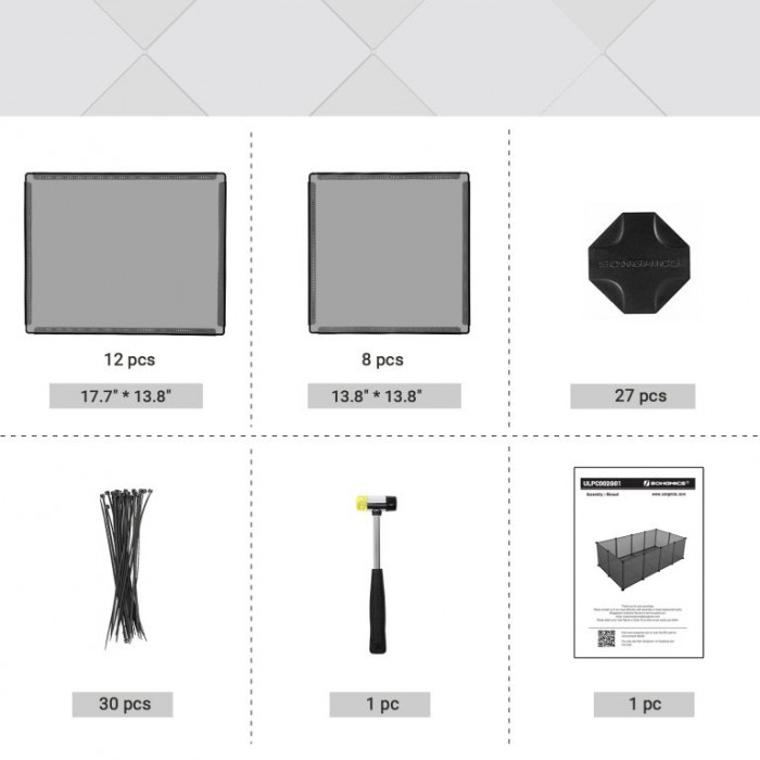 Montáž zvládnete během chvilky díky přiloženému gumovému kladívku a jednoduchým spojkám. Odolné plastové panely jsou lehké, snadno omyvatelné a chrání podlahu před nečistotami. Konstrukci lze kdykoliv rozložit, přestavět nebo rozšířit podle potřeby.