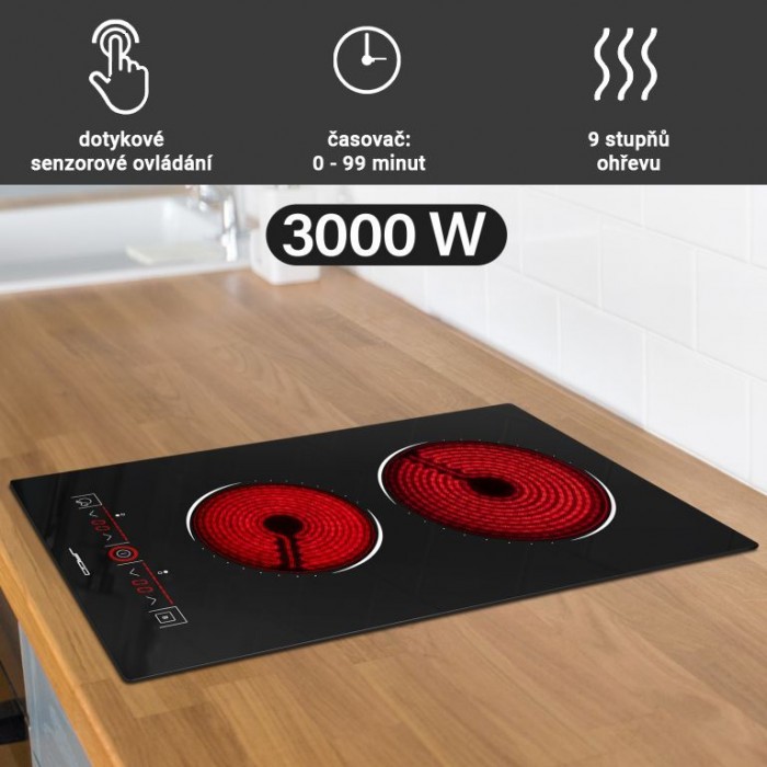 Vestavná sklokeramická varná deska se dvěma varnými zónami (Domino). Je vhodná pro všechny typy nádobí (keramika, nerezová ocel, železo, hliník, měď, žáruvzdorné sklo atd.). Má technologii dotykového ovládání a devítistupňovou regulaci teploty. S kabelem (třívodičové vedení) se zástrčkou VDE. Bezpečnostní funkce: Dětský bezpečnostní zámek, Indikátor zbytkového tepla, Ochrana proti přehřátí, Automatické vypnutí. Jednoduché a intuitivní ovládání, devět stupňů výkonu a časovač 0 - 99 minut dělají z této sklokeramické varné desky dokonalého spojence pro dlouholeté potěšení z vaření.