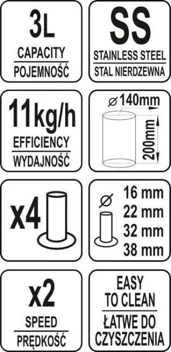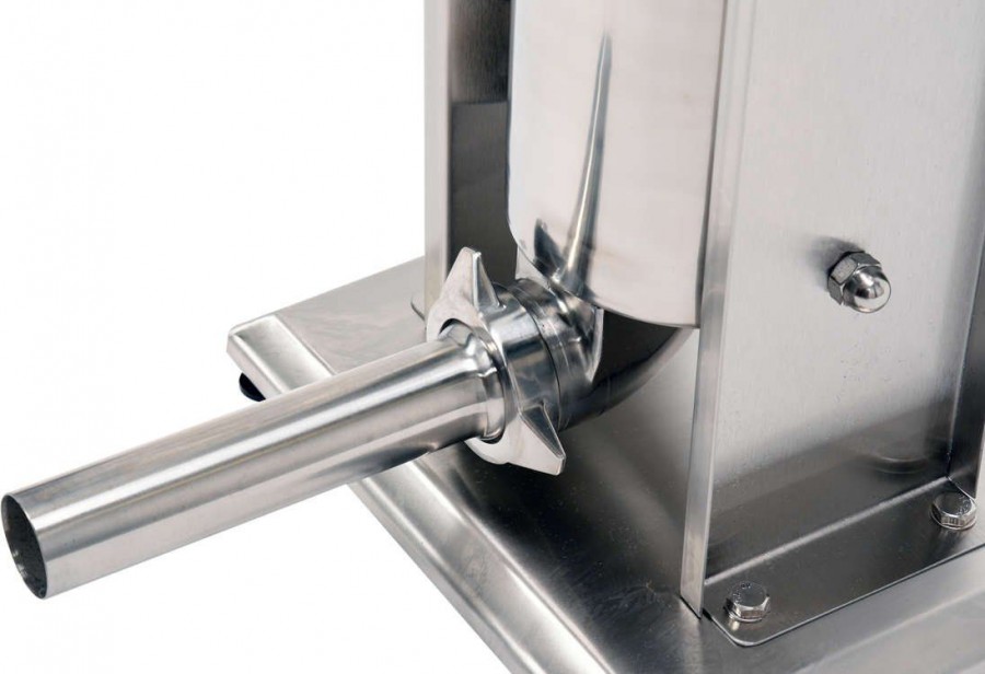Nádrž se všemi ostatními prvky, které přicházejí do styku s potravinami, jsou vyjímatelné, což vám umožní udržovat je řádně čisté. Zařízení obsahuje 4 vyměnitelné trychtýře o průměru 16 mm / 22 mm / 32 mm / 38 mm. Plnička má svislou konstrukci se stabilní základnou, navíc vybavenou gumovými protiskluzovými nožičkami.