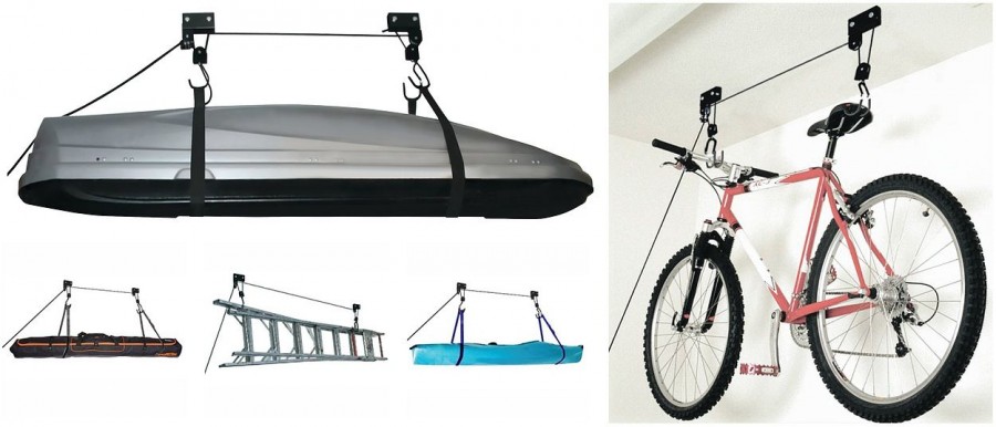 Držák funguje na principu kladkostroje a dokáže snadno zvednout střešní boxy, žebříky, lyže, jízdní kola, kajaky a další obdobné rozměrné předměty až do váhy 52 kg a umístit je pod strop místnosti s maximální výškou 4 m. Montáž držáku se provádí do pevných stropů pomocí šroubů a hmoždinek. Pomocí lana je možné lehce manipulovat se zavěšeným předmětem. Zařízení je vybaveno brzdou, která zabraňuje proklouznutí lana a znemožňuje pád zavěšeného předmětu. Balení navíc obsahuje popruh pro bezpečné uchycení předmětů různých typů a tvarů.