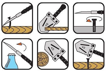 Lopatka s pouzdrem na pásek je ideální pro všechny trampy, rybáře, militaristy, hledače pokladů a milovníky outdoorových aktivit. Víceúčelová lopatka má dutou rukojeť, kde naleznete nástroje nezbytné k přežití v přírodě, jako je vlasec na ryby, sirky, hřebík nebo kompas.