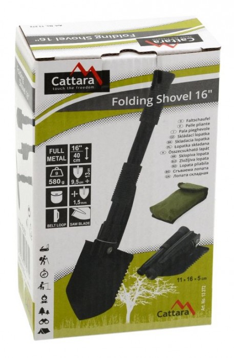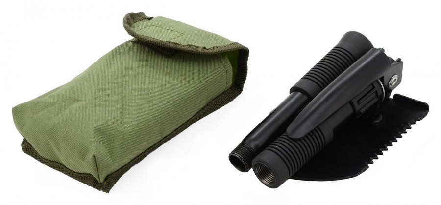Jedná se o lopatku, která má rozměry ve složeném stavu 9,5 x 16 cm a prodávána je spolu s odolným textilním pouzdrem zelené barvy, které lze připevnit za opasek.