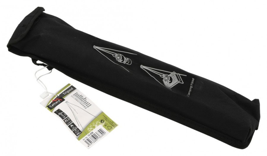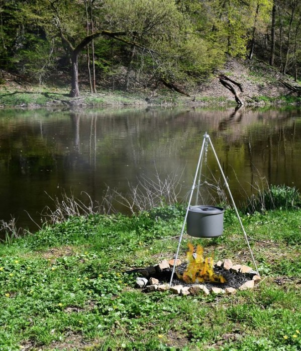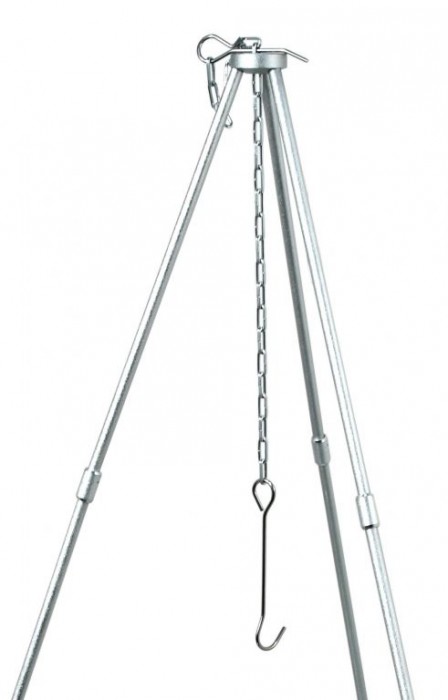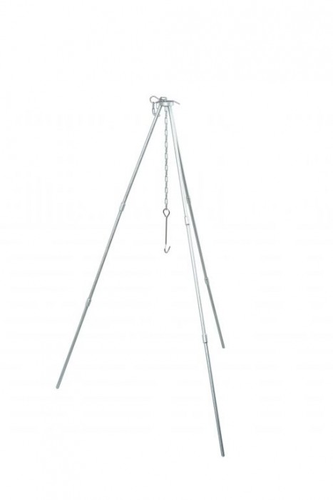 Praktický skládací tripod je výtečným doplňkem pro plynový vařič, ale i ohniště. Zhotovený je třemi skládacími nohami z odolného hliníku a hákem zavěšeným na řetězu s celkovou výškou 86 cm po sestavení. Ve složeném stavu má zařízení hmotnost 460 g a rozměry 34 x 7 x 3,5 cm, nezabírá tedy mnoho místa a je tak možné, mít ho s sebou kdekoliv na čundru.