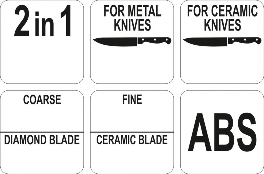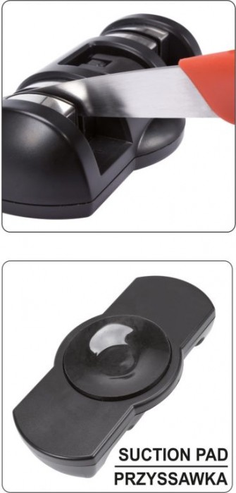 Unikátní brousek na ocelové a keramické nože. Brousek je opatřen 2 čepelkami. Diamantová je určená pro předostření ocelových a keramických nožů. Keramická čepel je určená pro doostření nožů. Tělo brousku je vyrobeno z tvrdého ABS plastu a je opatřeno přísavkou, díky čemuž je možné brousek umístit na pevno na dané místo.