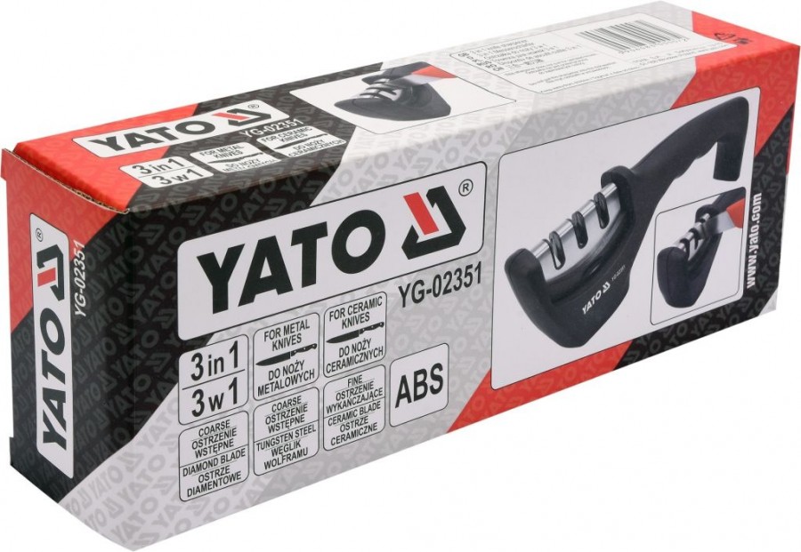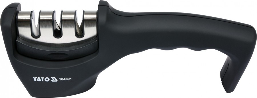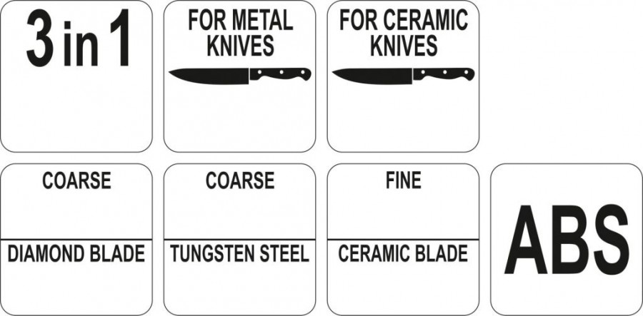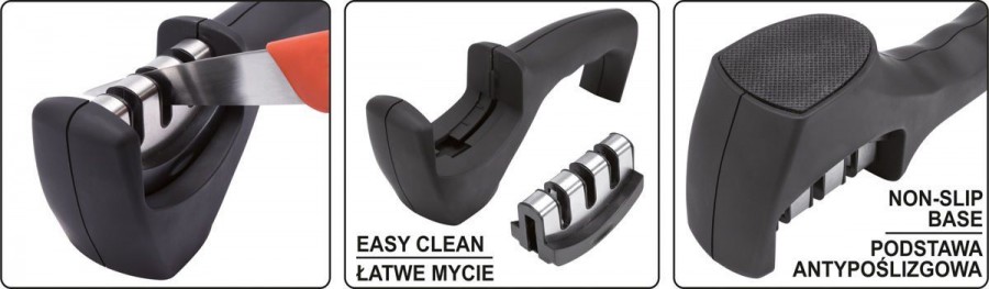 Multifunkční brousek na ocelové a keramické nože. Brousek je opatřen 3 čepelkami. Diamantová je určená pro předostření keramických nožů. Čepel z karbidu wolframu je určená pro předostření ocelových nožů. Keramická čepel je určená pro doostření nožů. Tělo brousku je vyrobeno z tvrdého ABS plastu a je opatřeno ergonomicky tvarovanou, pohodlnou rukojetí s protiskluzovou základnou, která zajišťuje bezpečné uchopení během broušení. Odnímatelná část čepelí umožňuje snadné a důkladné čištění.