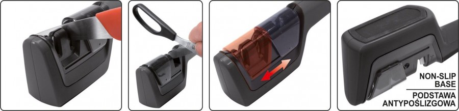 Multifunkční brousek na ocelové a keramické nože a ostření nůžek. Pohyblivá čepel z karbidu wolframu automaticky kopíruje úhel čepele nůžek a tím usnadňuje jejich ostření. Brousek je opatřen 3 čepelkami. Diamantová je určená pro předostření keramických nožů. Čepel z karbidu wolframu je určená pro předostření ocelových nožů. Keramická čepel je určená pro doostření nožů. Tělo brousku je vyrobeno z tvrdého ABS plastu a je opatřeno ergonomicky tvarovanou, pohodlnou rukojetí s protiskluzovou základnou, která zajišťuje bezpečné uchopení během broušení. Odnímatelná část čepelí umožňuje snadné a důkladné čištění.