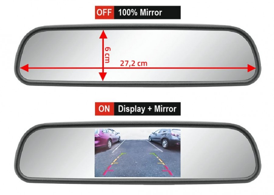 Pomocí zabudovaných klipů je snadné toto zrcátko s displejem jednoduše nasadit na většinu běžných zpětných zrcátek v automobilu. Díky jedinečné technologii není ve vypnutém stavu displej vůbec viditelný a celá plocha zrcátka je tak využitelná jako standardní zpětné zrcátko. Díky inteligentnímu software zařízení, je po zjištění signálu ve video vstupu automaticky aktivován obraz videa. Přednostní vstup AV2 je určen pro parkovací kameru, jejíž obraz bude vždy nadřazený a bude zobrazen vždy, když bude parkovací kamera aktivní.