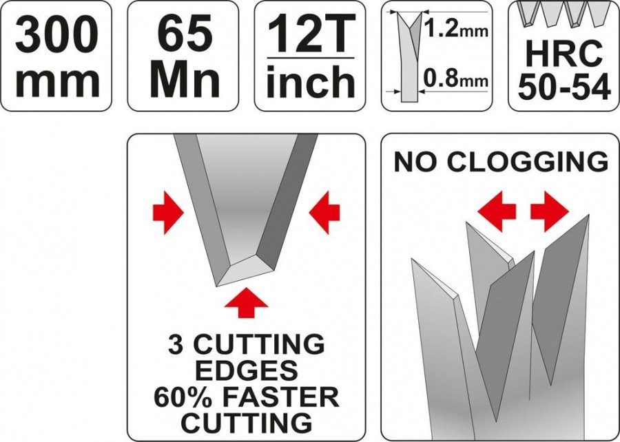 Pilové zuby mají speciální trojstranný profil, uzpůsobený k agresivnímu řezání v obou směrech. Kromě toho jsou zuby vytvrzeny na HRC 50-54.