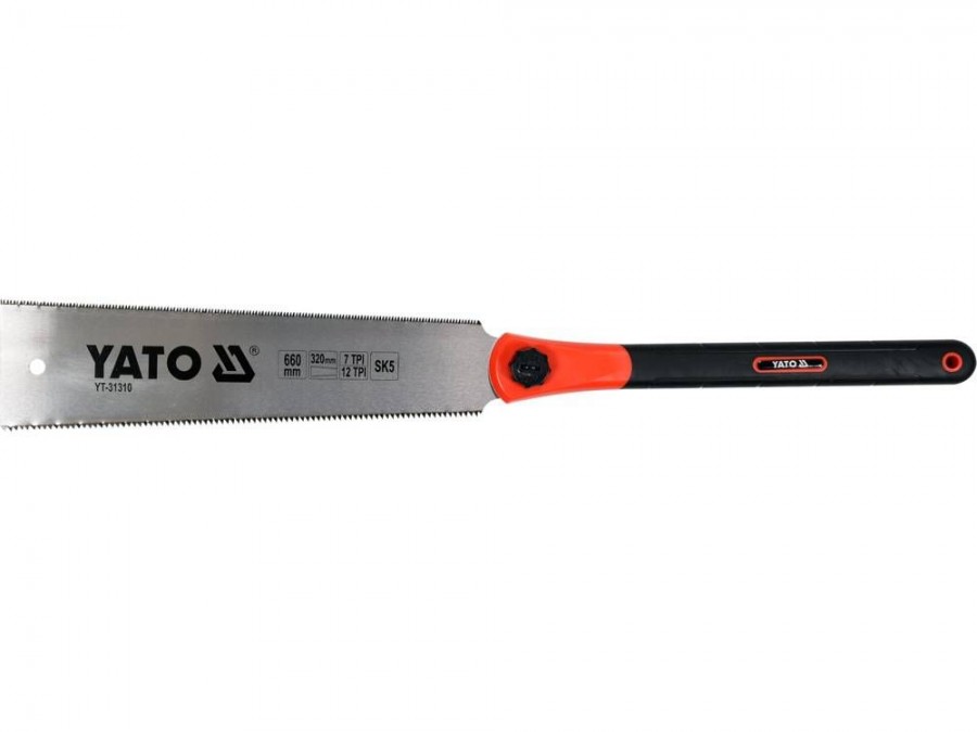 Japonská oboustranná ruční pila (tzv. ryoba). Kalené zuby na obou hranách čepele. Rozteč 7 tpi na jedné straně a 12 tpi na druhé straně výrazně zvyšuje využitelnost pily.