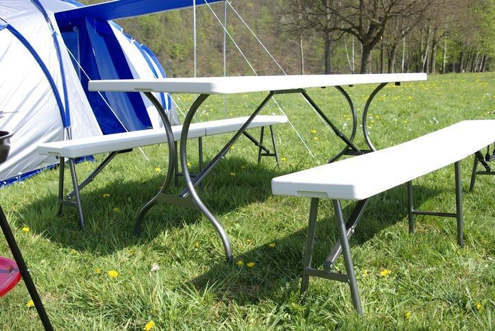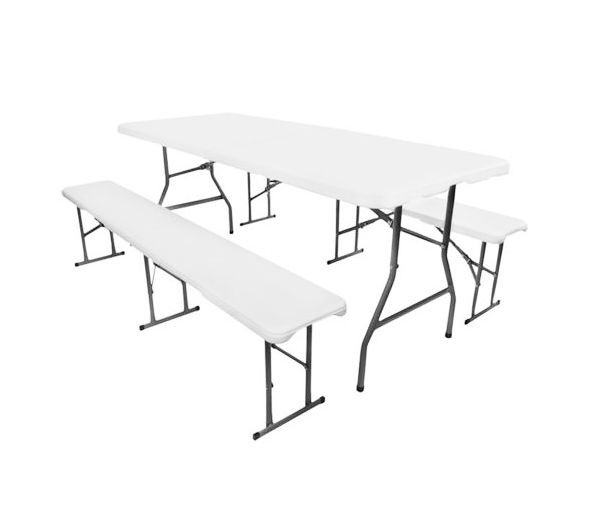 Velice pěkný, stabilní a odolný zahradní stůl se 2 lavicemi pro 6 - 8 osob. Stůl a lavice jsou skládací, lze je proto snadno přepravovat a skladovat. Tento set nábytku můžete použít na jakékoliv oslavy, na terasu, zahradu nebo při kempování.
