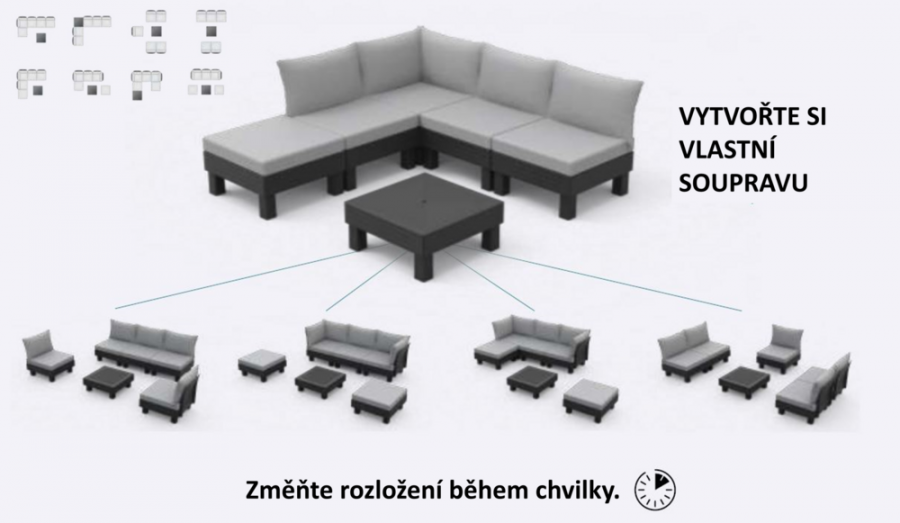Vytvořte si dokonalé venkovní posezení přesně podle svých představ. Set ELEMENTS nabízí maximální flexibilitu díky chytrému modulárnímu systému, který umožňuje snadno měnit uspořádání podle aktuální potřeby. Pohodlné podušky a opěrky z příjemné polybavlny zajistí relaxaci na zahradě i terase, ať už si chcete užít chvíle s rodinou nebo přáteli.