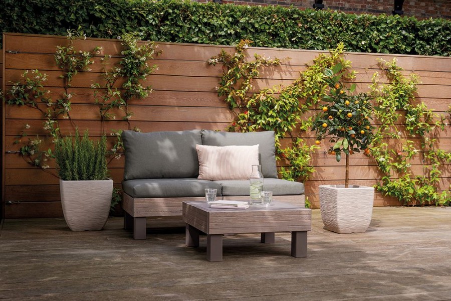 Pevný lisovaný plast v designu dřeva je odolný vůči povětrnostním vlivům a UV záření. Montáž je rychlá a jednoduchá, údržba nenáročná a díky kompaktním rozměrům set snadno uskladníte. Kovové spojky zajišťují stabilitu a dlouhou životnost celého posezení.