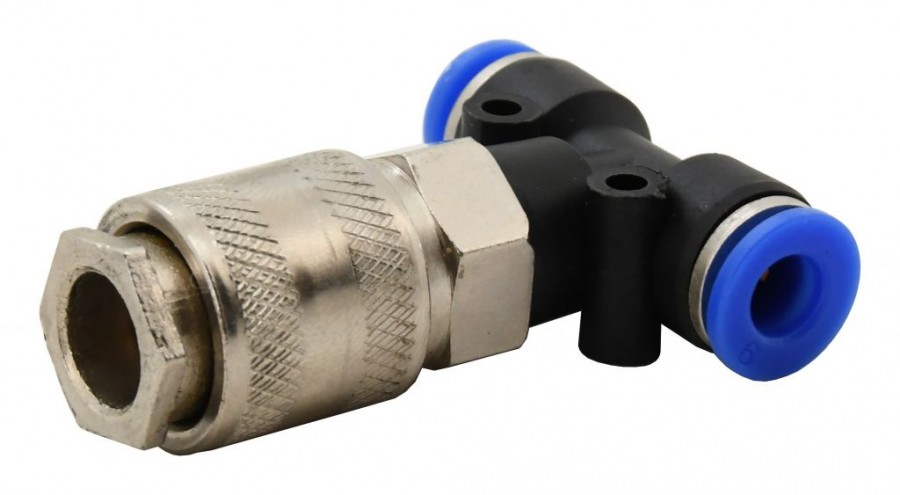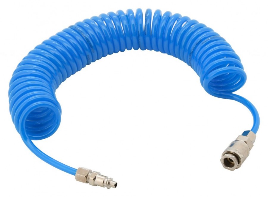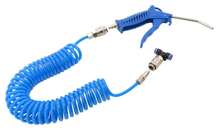 Vzduchová pistole v sadě s kroucenou hadicí a T-adaptérem je zhotovená z odolného plastu s kovovou tryskou, určená k odfukování nečistot a prachu. Oceníte ji zejména v hůře dostupných místech. Přední část těla je opatřena tvarovaným háčkem pro možnost zavěšení, ve spodní části je kovová koncovka pro rychlospojku. Hadice s průměrem 6 mm a délou 5 m je kroucená, na jednom konci opatřena rychlospojkou pro rychlé připnutí pistole a na druhémi kocovkou pro připojení adaptéru. T-adaptér je určen pro připojení k 6 mm rozvodu stlačeného vzduchu a k připojení ke konci kroucené hadice pomocí rychlospojky.