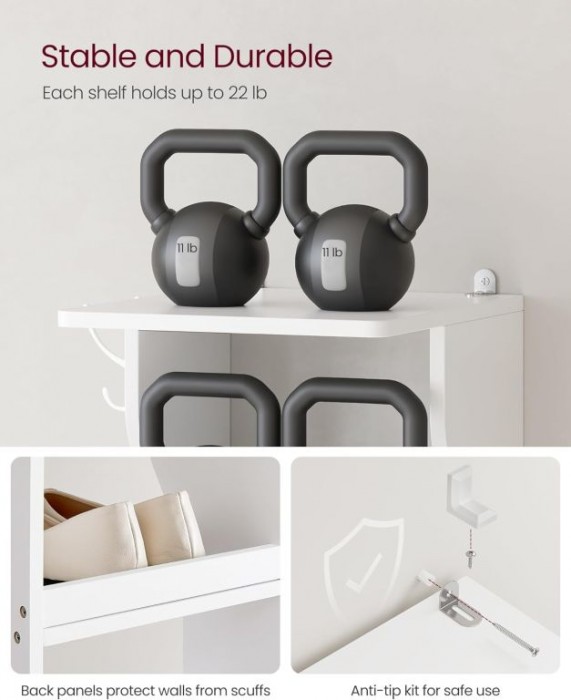 Odolná dřevotříska a ocelové háčky zajišťují dlouhou životnost a stabilitu. Nosnost 10 kg na polici umožní uložení i těžších bot, zatímco protiskluzové prvky a možnost uchycení ke zdi zvýší bezpečnost. Montáž zvládnete během chvíle.