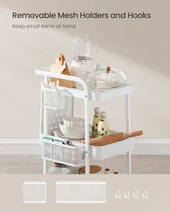 Objevte univerzální pojízdný regál, který vám pomůže udržet pořádek v každé místnosti. Díky třem prostorným policím, háčkům a přídavným pegboardům snadno uložíte vše potřebné – od kuchyňských potřeb po kreativní pomůcky. Elegantní bílý design skvěle zapadne do moderního interiéru a umožní vám mít vše po ruce.