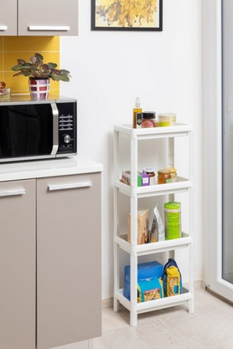Multifunkční čtyřpatrový regál představuje praktický a stylový způsob pro efektivní využití menších prostorů a pro snadnou organizaci ve Vašem domě. Nabízí dodatečný prostor pro uložení potravin, kuchyňských pomůcek či jiných drobností například v koupelně.