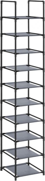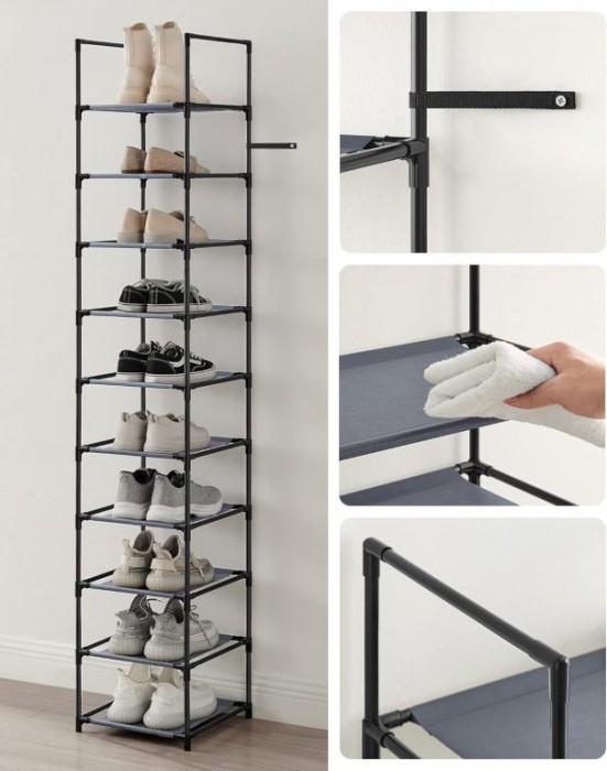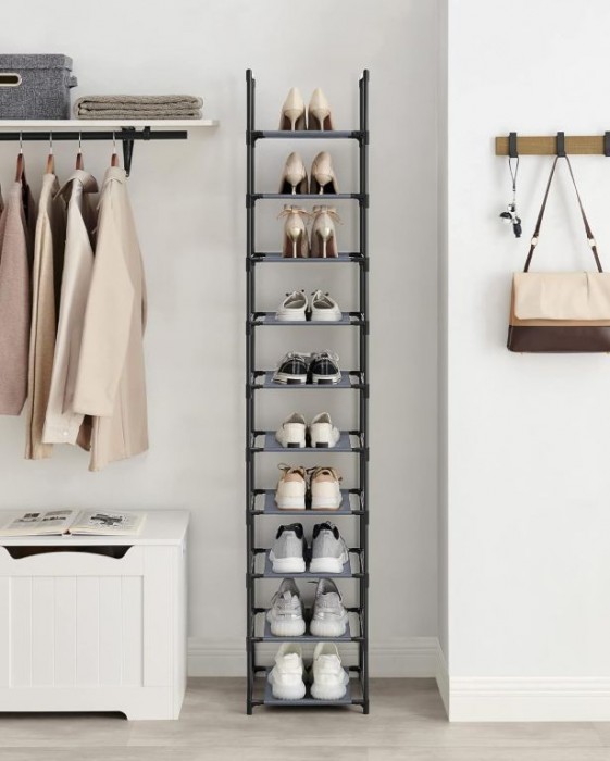 Už žádné rozházené boty v předsíni nebo skříni. Regál na boty s 10 policemi se stane elegantním a praktickým pomocníkem, který šetří místo a udržuje domácnost upravenou. Jeho nadčasový šedý design se hodí do každého interiéru a působí čistě a moderně.