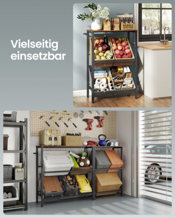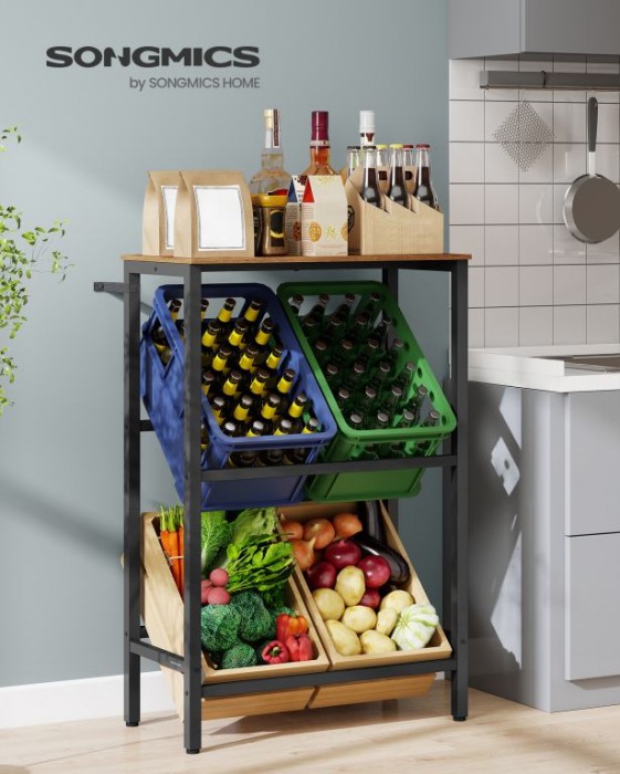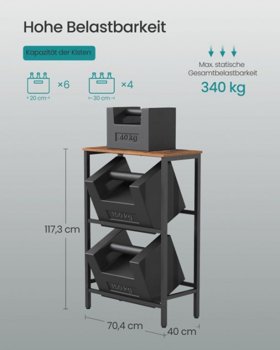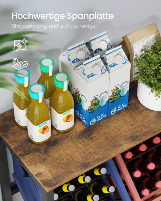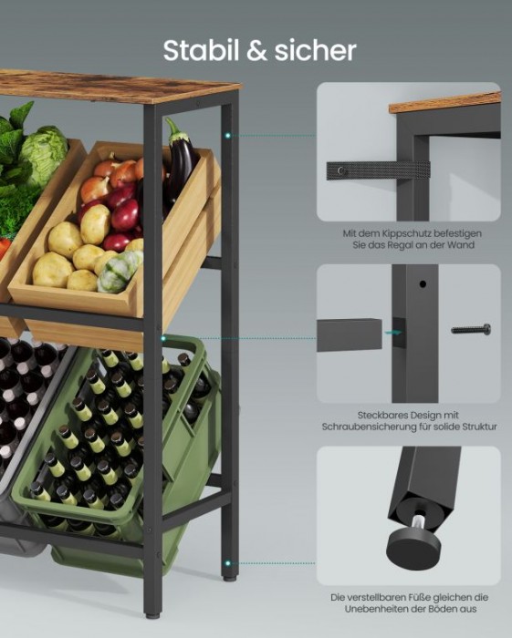 Vneste do svého domova pořádek a styl s tímto víceúčelovým regálem na nápoje a ovoce. Jeho elegantní design a vysoká nosnost vám umožní skladovat vše od lahví až po čerstvou zeleninu, ať už v kuchyni, obýváku nebo spíži. Praktický sklon 15° usnadňuje manipulaci a zajišťuje bezpečné uložení.