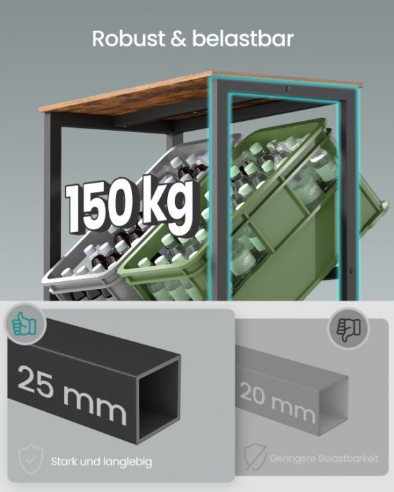 Robustní ocelová konstrukce s čtvercovým rámem a šroubovacím uchycením zaručuje stabilitu i při plném zatížení. Nastavitelné nožky vyrovnají nerovnosti podlahy. Montáž je jednoduchá díky přehlednému návodu a přiloženému nářadí. Povrch je snadno omyvatelný a odolný proti poškrábání.