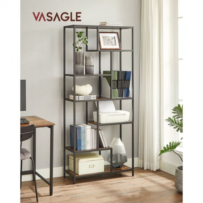 Vneste do svého interiéru pořádek i styl. Tato originální knihovna s šesti policemi v geometrickém designu nabízí dostatek prostoru pro knihy, dekorace i osobní předměty. Díky kombinaci rustikálně hnědého dřeva a černého kovu působí elegantně a přirozeně zapadne do každé místnosti – od obýváku až po pracovnu.